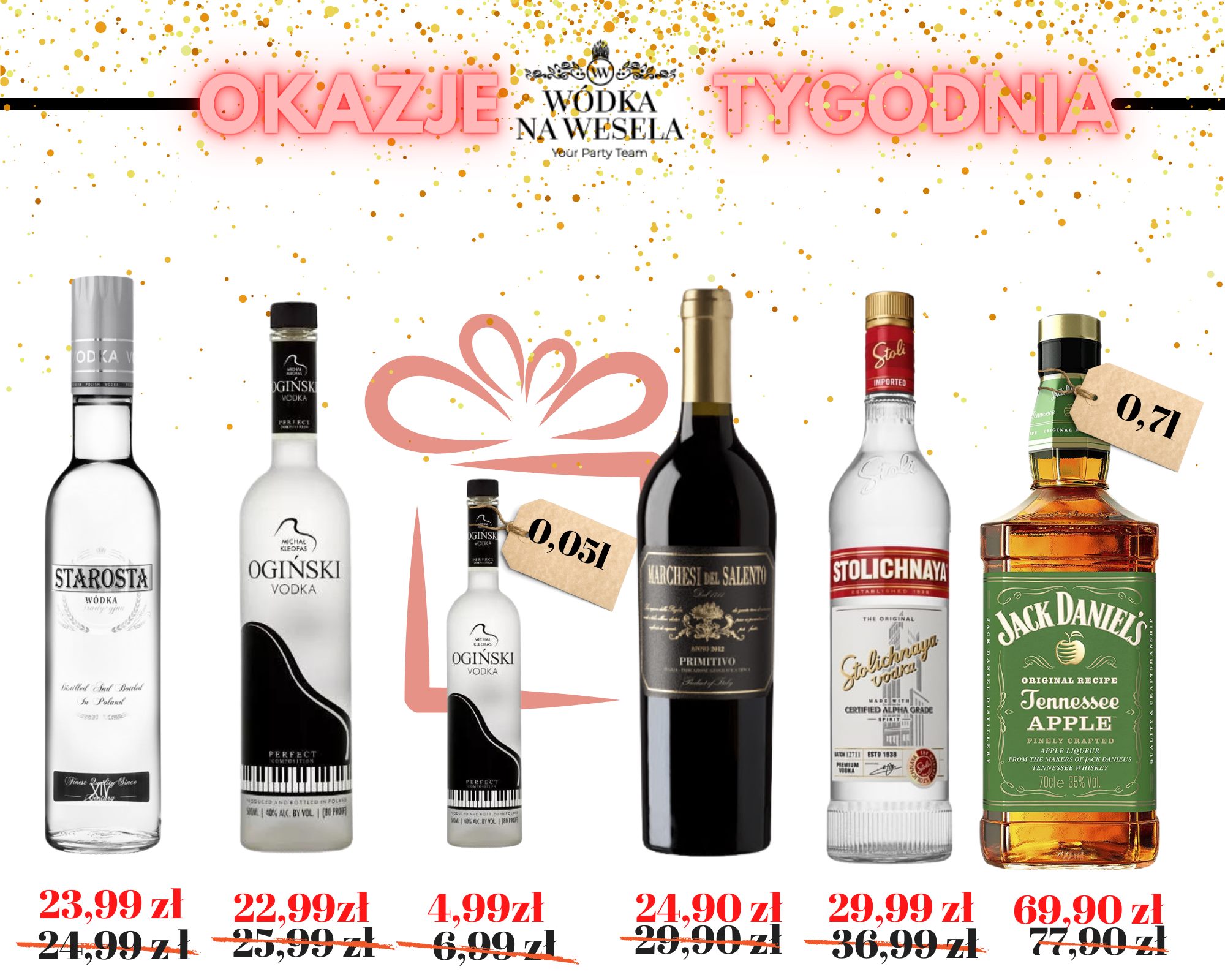 Znajdziecie wśród nich mini Ogińskiego, idealnego na prezenty dla gości i ulubioną weselną whisky Jack Daniels w wersji Apple i klasycznej.